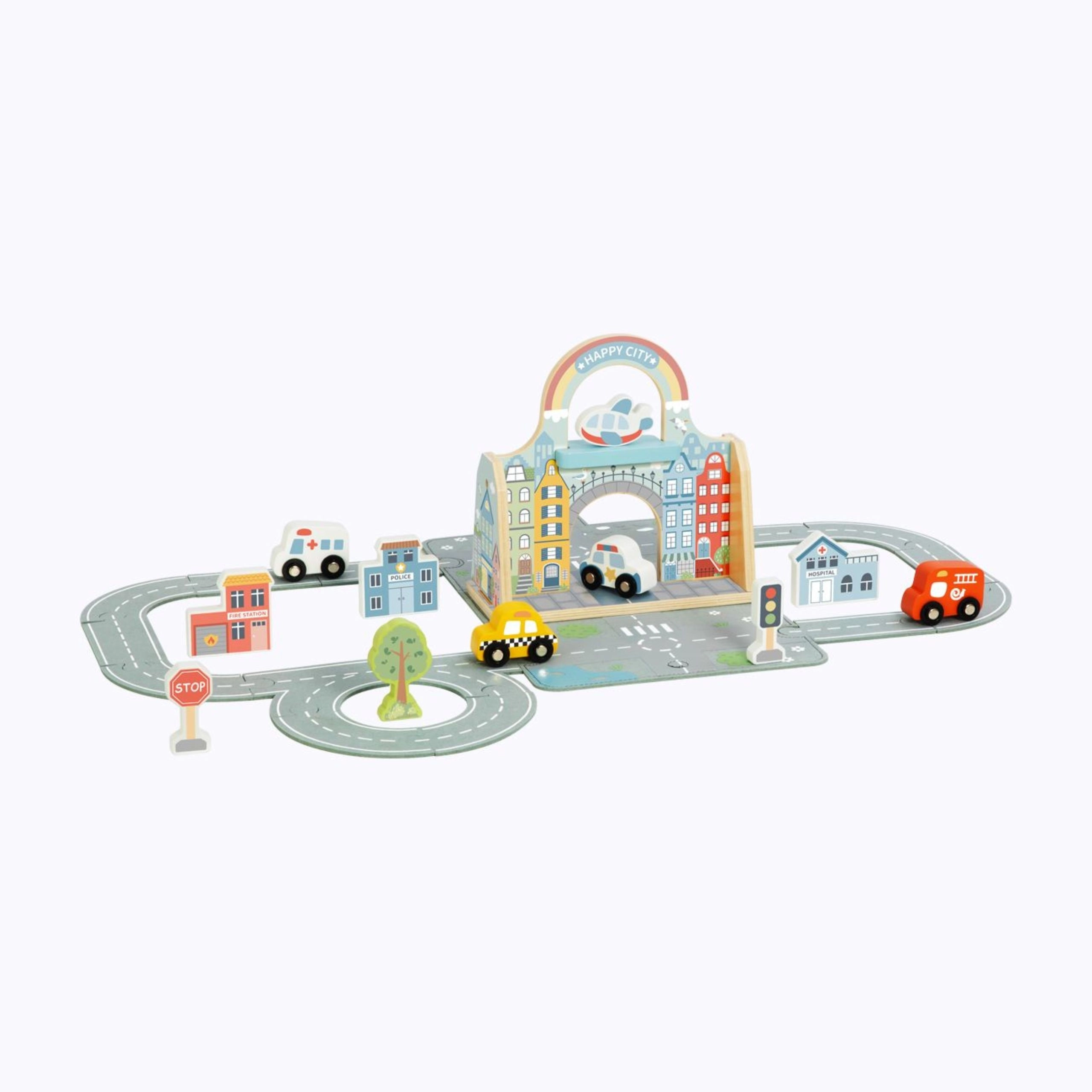 Odkryj czar przenośnego mini miasta od Tooky Toy – kompaktowy zestaw w eleganckiej torbie, który rozkłada się w kompletną scenę do zabawy z drogami, budynkami, znakami i pojazdami. Dzięki składanej torbie, elastycznym elementom dróg i kolorowym drewnianym elementom dzieci tworzą własne historie gdziekolwiek i kiedykolwiek.