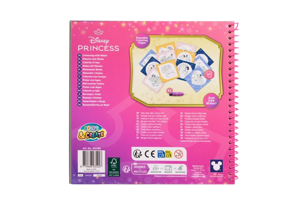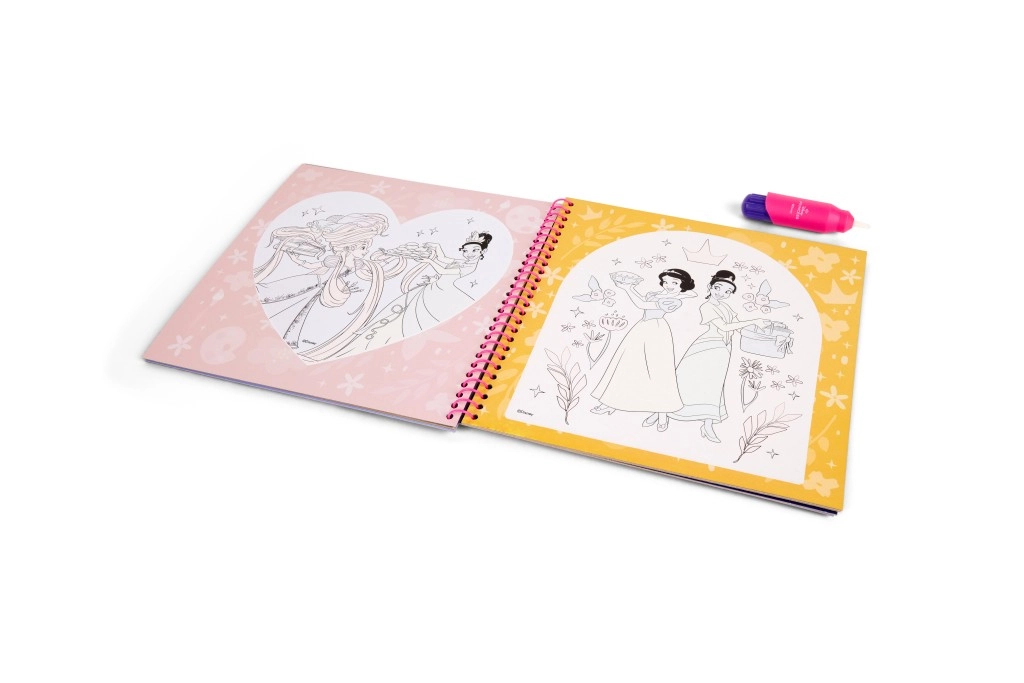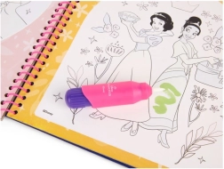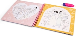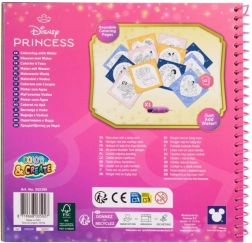 Ta kreatywna książka zapewnia dzieciom bezpieczne i czyste malowanie bez bałaganu. Dzięki wodnemu pędzelkowi po przetarciu ilustracji ujawniają się przepiękne obrazki ulubionych Disney Księżniczek. Gdy strona wyschnie, kolory bledną i dzieci mogą malować wciąż od nowa.