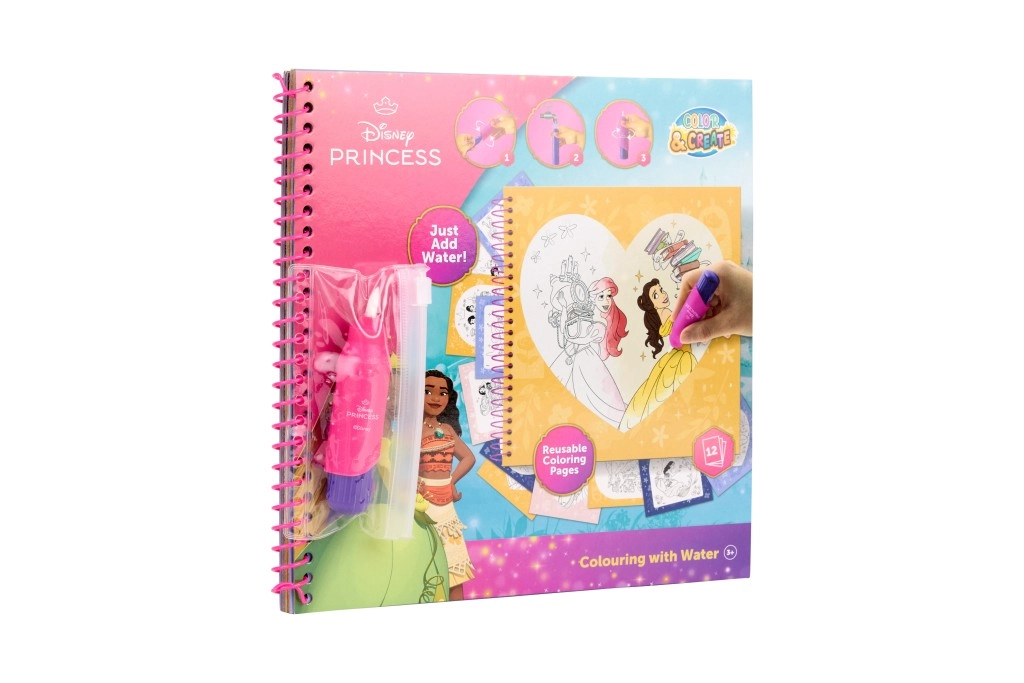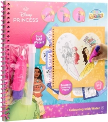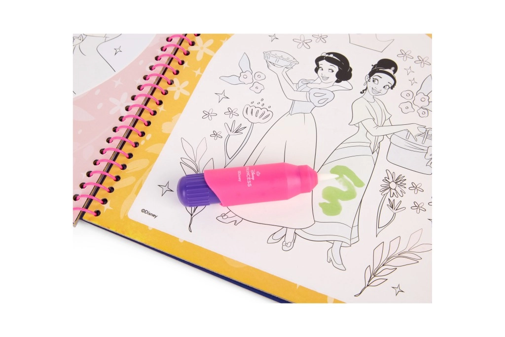 Odkryj czarodziejską książkę do kolorowania z motywami Disney Księżniczek, która działa na zasadzie wodnego malowania. Wystarczy napełnić dołączony pędzelek wodą, przejechać po obrazku, a kolory pojawią się same. Po wyschnięciu znikają, dzięki czemu książka jest wielokrotnego użytku – świetna w podróży i do domowej twórczości.