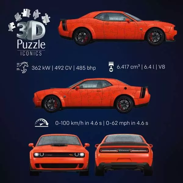 Ten model puzzli 3D z serii Iconics wiernie oddaje kultowy wygląd DODGE CHALLENGER R/T SCAT PACK WIDEBODY. Dzięki precyzyjnie ukształtowanym i ponumerowanym elementom składanie jest intuicyjne i nie wymaga kleju – poszczególne części pewnie do siebie pasują.