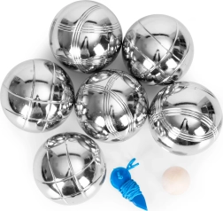 Zestaw zawiera 6 wytrzymałych kul z chromowanej stali o średnicy 72 mm i masie ok. 700 g dla wygodnego i stabilnego rzutu. Dwa różne wzory rowkowania ułatwiają rozróżnienie kul podczas gry. Drewniany cochonnet służy jako cel, a sznurek pomiarowy pomaga sprawiedliwie rozstrzygać sporne sytuacje.