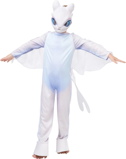 Zamień małego fana w bohatera filmu Jak wytresować smoka dzięki autentycznemu kostiumowi Błyskawicy dla dzieci w wieku 7–8 lat. Kostium zachwyca wiernym designem białego smoka z delikatnymi niebieskimi przejściami, realistyczną głową z wyrazistymi niebieskimi oczami oraz przezroczystymi skrzydłami dla imponującego efektu w ruchu.