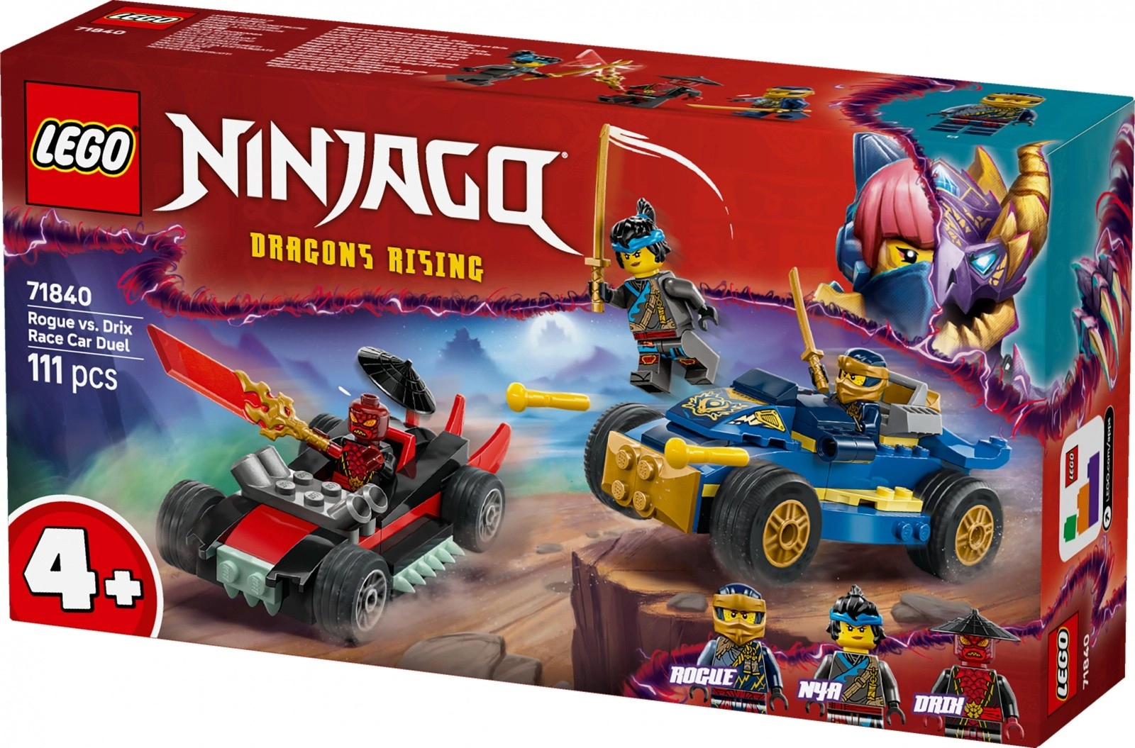 Odkryj dynamiczny zestaw konstrukcyjny LEGO NINJAGO dla dzieci od 4 lat – wyścig Rogue vs. Drix z dwoma autami, trzema minifigurkami i łatwym elementem startowym do szybkiego budowania. Czekają na ciebie miotacze, złote katany i mnóstwo emocjonujących starć dobra ze złem.