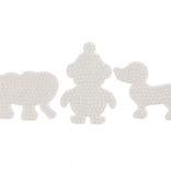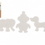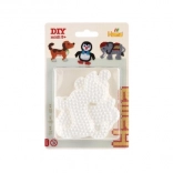 Zestaw podstawek Hama do koralików do prasowania pozwala dzieciom od 5 lat tworzyć kolorowe obrazki dziękibiałym plastikowym podkładkom w kształcie słonia, pingwina oraz pieska.
