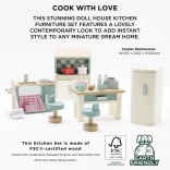 Idealna kuchnia do domku dla lalek od Le Toy Van. Ten piękny drewniany zestaw zawiera wszystko, czego potrzebujesz do miniaturowych kulinarnych przygód - zlewozmywak, kuchenkę, piekarnik, lodówkę i stół z krzesłami. Wszystko ręcznie wykonane z odnawialnych materiałów.