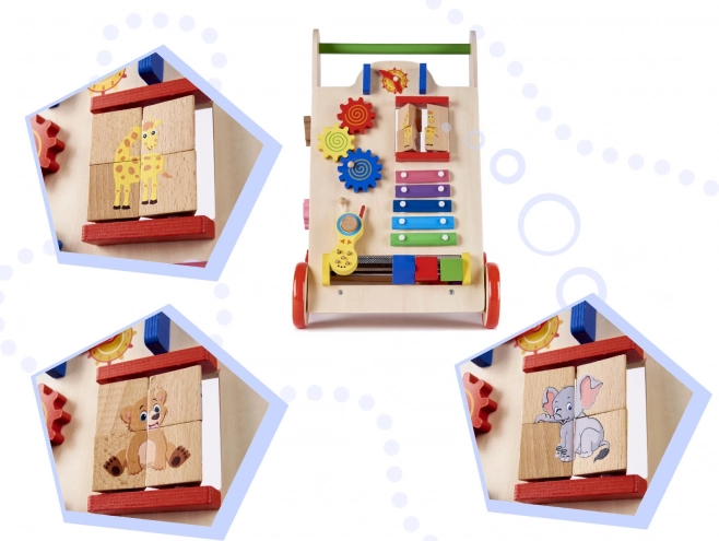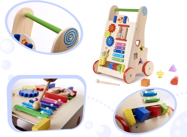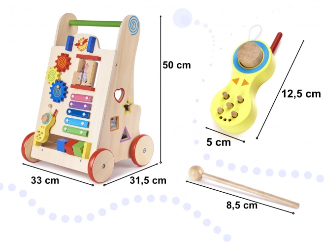 Wszystkie elementy chodzika są starannie wyszlifowane, aby chronić małe rączki przed drzazgami, oraz pomalowane nietoksycznymi, ekologicznymi farbami. Konstrukcja jest stabilna, z drewnianymi kołami pokrytymi gumą dla większego bezpieczeństwa. Chodzik ma po bokach także sorter kształtów z czterema kolorowymi klockami oraz labirynt z uroczymi zwierzątkami.