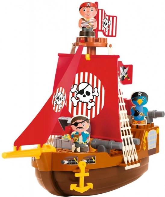 Statek jest wyposażony w dopracowane elementy, takie jak czerwone żagle z motywem czaszki i skrzyżowanych kości, które zapewnią dzieciom autentyczne pirackie wrażenia.