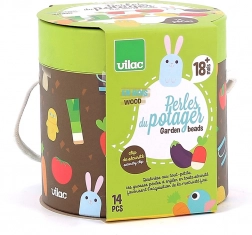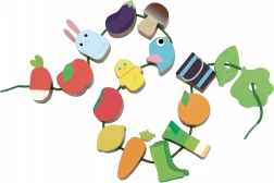 Zestaw 14 ilustrowanych koralików (np. bakłażan, pomidor, ptaszek, kalosze) pobudza wyobraźnię, uczy kolorów i nazywania.