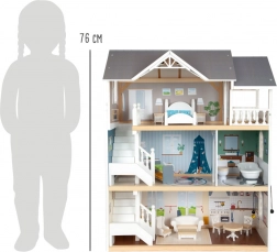 Domek dla lalek ma jasną zewnętrzną fasadę, nowoczesny design i funkcjonalne elementy, takie jak przesuwne drzwi i otwierane okna.