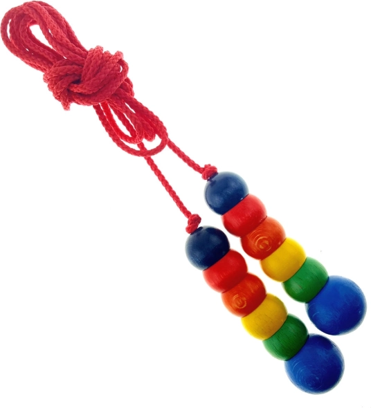 Klasyczna kolorowa skakanka HESS z drewnianymi rączkami dla dzieci od 3 lat. Dzięki regulowanej długości 2,3 m rośnie razem z dzieckiem, wspiera rozwój motoryki i koordynacji i jest wykonana z ekologicznego drewna z trwałymi, bezpiecznymi farbami.