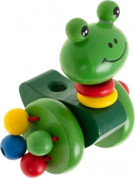 Żabka ma dwa duże kółka z kolorowymi koralikami, które grzechoczą podczas ruchu, co czyni zabawę jeszcze bardziej atrakcyjną. Zabawka jest starannie wykonana, z gładkimi krawędziami, co eliminuje ryzyko zranienia drzazgą.