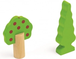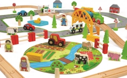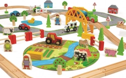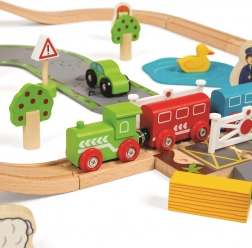 Ta drewniana kolejka z wiejską drogą to doskonałe połączenie kolejki i trasy samochodowej, które naśladują prawdziwy świat transportu. Dzięki mostom i przejazdom twoje dzieci wkroczą do świata pełnego zabawnych przygód. Wszystko jest uzupełnione lokalnymi dodatkami, takimi jak farma, budynki i drzewa, które upiększają okolicę.