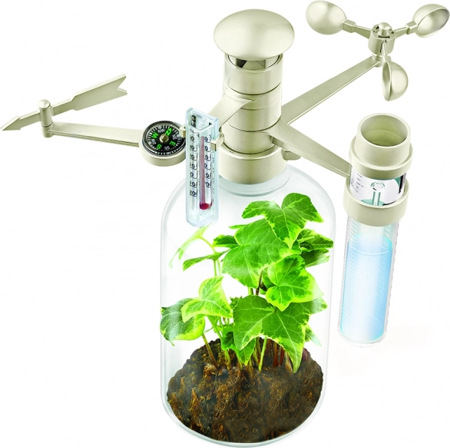 Zabawna i edukacyjna stacja meteorologiczna dla dzieci od 5 lat. Ta stacja umożliwia dzieciom obserwować i zapisywać dane pogodowe za pomocą mini obserwatorium oraz zrozumieć efekty efektu cieplarnianego dzięki butelce z terrarium.