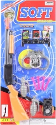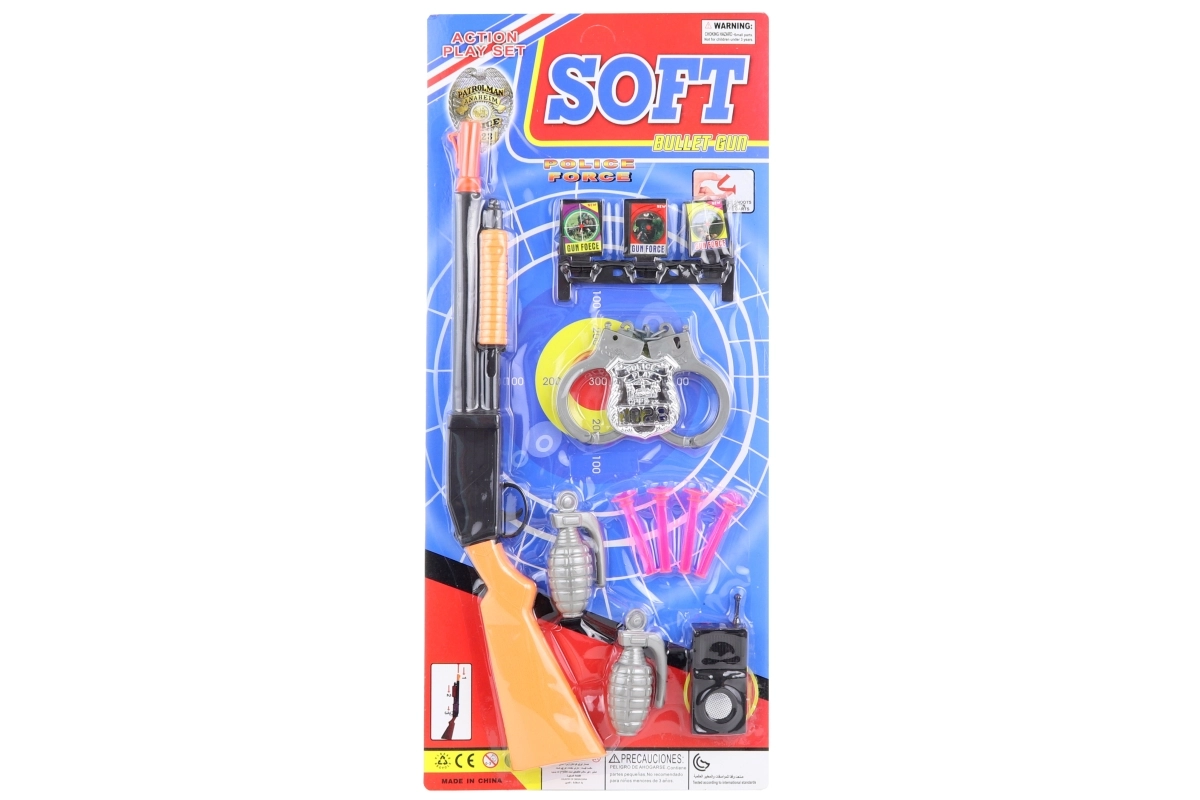 Ten zestaw akcji ucieszy wszystkich małych miłośników przygodowych zabaw. Główną częścią jest plastikowy karabin na naciąg, który strzela strzałkami z przyssawkami – bezpiecznie przylegają do gładkiej powierzchni. W opakowaniu znajdziesz także granaty, krótkofalówkę, kajdanki, odznakę i tarczę treningową do ćwiczenia celności.