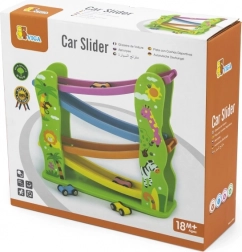 Ta pięknie kolorowa drewniana zjeżdżalnia jest idealna dla najmłodszych, którzy chcą się bawić i jednocześnie rozwijać swoje umiejętności. Zawiera rampę z kilkoma poziomami w różnych kolorach i umożliwia samochodzikiom płynny ruch po torze.