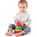Táto hračka spája dva výborné spôsoby zábavy – ako pyramída a ako káča. Deti navliekajú farebné drevené krúžky na tyčku od najväčšieho po najmenší a zároveň rozvíjajú kreativitu a jemnú motoriku. Okrem toho možno hračku roztočiť ako káču, čo pridáva ďalšiu úroveň zábavy.