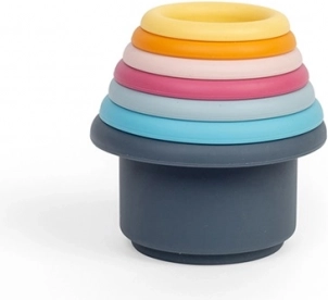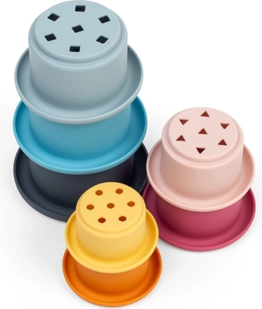 Bezplastový 100 % silikón je mäkký do detských rúk, zároveň veľmi odolný voči teplotám a škvrnám. Ľahko sa udržiava – stačí teplá voda a jemné mydlo alebo umývačka. Hra s kelímkami podporuje motorické zručnosti, senzorické vnímanie, balans a prvé logické myslenie.