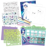 Súčasťou setu je bohaté príslušenstvo pre nápaditú tvorbu: samolepky, šablóny, textúry aj kvalitné obojstranné pastelky. Priložené ukážky techník a základná teória farieb pomôžu zlepšiť kresliarske zručnosti a podporia sebavyjadrenie.