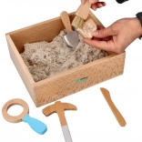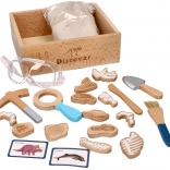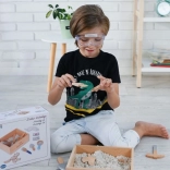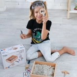 Súčasťou balenia je všetko, čo malý paleontológ potrebuje: od truhličky objaviteľa cez nástroje (kladivko, lupa, nožík, štetček, lopatka) až po kosti dinosaurov, ryby a skameneliny. Dve obojstranné karty pomáhajú ľahko identifikovať vykopané nálezy. Piesok je vyrobený v EÚ a spĺňa bezpečnostné normy.