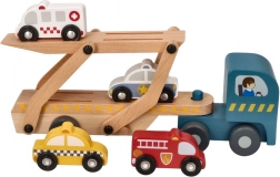Sada obsahuje policajné auto, hasičské vozidlo, sanitku a taxi, všetky vyrobené z kvalitného dreva s detailnými maľbami.