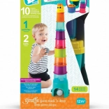 Postavte si s vaším drobčekom farebnú žirafiu vežu XL vysokú až 80 cm! Sada ponúka 10 stohovateľných kelímkov, kladivko a 2 guličky na zábavné kotúľanie tunelom a rozvíjanie jemnej motoriky, koordinácie ruka–oko a objavovania. Všetkých 14 dielov ľahko uložíte do praktického prepravného boxu.