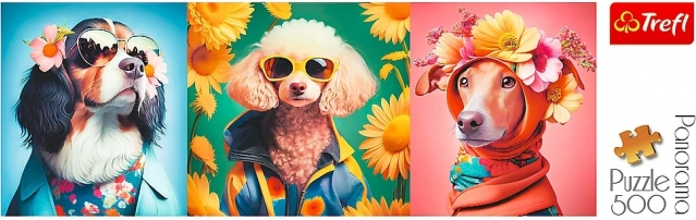 Objavte hravý svet psiej módnej prehliadky v pestrých farbách a pôsobivom panoramatickom formáte. Štýlovo oblečení psíci so slnečnými okuliarmi a kvetmi premenia skladanie na zábavný zážitok a hotový obraz sa stane originálnou dekoráciou.