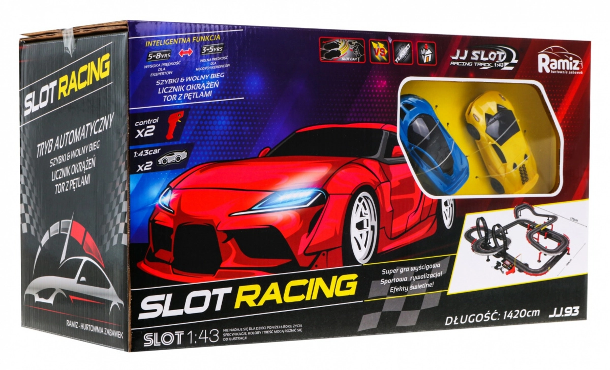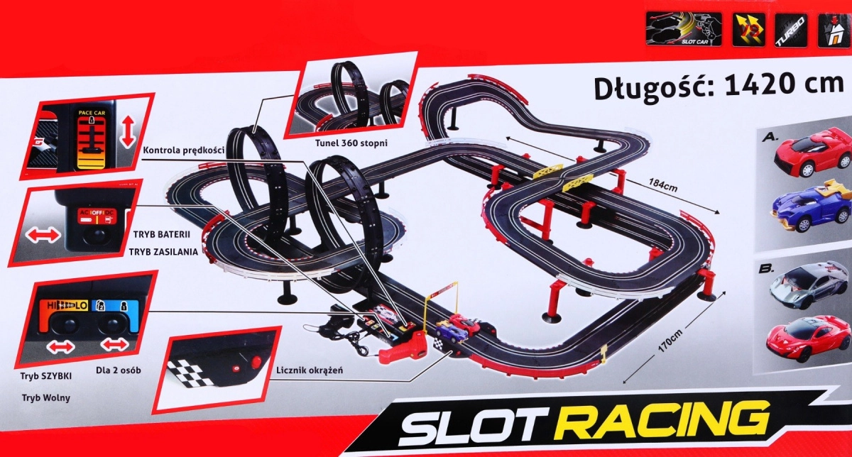 Závodná dráha s 14 metrami dĺžky ponúka nezabudnuteľnú zábavu pre mladých závodných nadšencov. S touto dráhou môžu deti zažiť skutočnú vzrušujúcu simuláciu rýchlych závodov s prepínateľnými režimami rýchlosti.