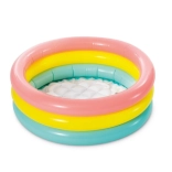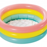 Tri nafukovacie kruhy vo výrazných odtieňoch ružovej, žltej a zelenej pridávajú bazénu na atraktivite a lákajú deti ku hre.