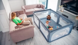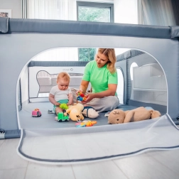 Ohrádka ponúka bezpečné miesto na hranie bez rušivých prvkov vo vnútri – všetky konštrukčné časti sú umiestnené zvonka. Mäkké sieťované bočnice umožňujú dieťaťu trénovať vstávanie, prvé krôčiky či pretáčanie s minimálnym rizikom a zároveň poskytujú skvelú viditeľnosť pre rodičov. Vyššie a pevné steny zabraňujú samovoľnému opusteniu, takže dieťa má čistý a chránený priestor na každodennú zábavu.