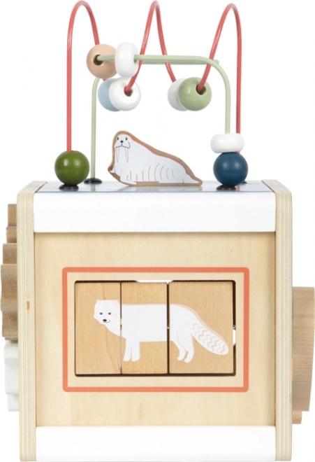 Doprajte deťom nekonečnú zábavu a učenie s drevenou motorickou kockou SMALL FOOT ARCTIC zo 100 % FSC dreva. Na piatich stranách ponúka korálkové bludiská, vkladanie tvarov, posuvné labyrinty, ozubené kolieska aj otáčacie prvky, ktoré podporujú jemnú motoriku, logiku a rozpoznávanie farieb a tvarov. Odnímateľné veko uľahčí ukladanie dielikov, zaoblené hrany zaistia bezpečnú hru a moderný arktický dizajn krásne zapadne do detskej izby.