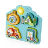 Správne vloženie dielika odmení dieťa realistickými zvukmi dopravných prostriedkov a zvieratiek. Tlačidlo slniečka pridá ďalšie efekty a podnieti zvedavosť.
