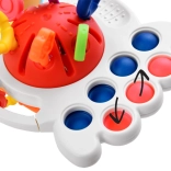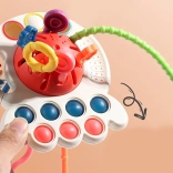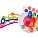 Hračka má mäkké senzomotorické tlačidlá, ktoré podporujú manipuláciu. Deti si môžu užívať rôzne dotykové podnety pomocou troch plastových krúžkov s rôznou textúrou a povrchom s výraznou textúrou guličiek.