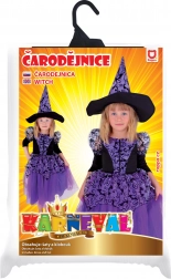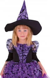 Súčasťou kostýmu je zladený klobúk zdobený rovnakým vzorom ako šaty, ktorý dodáva kostýmu autentický vzhľad čarodejnice.