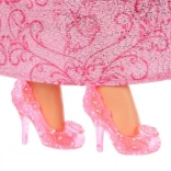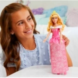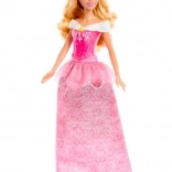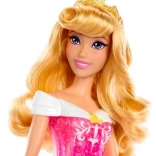 Bábika je oblečená do ružových šiat s trblietavými detailmi a ozdobou, ktoré napodobňujú filmovú podobu Aurory.