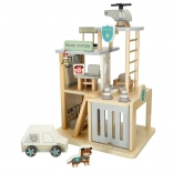 Tento premyslený drevený set prenesie deti do sveta záchranných akcií. Na prízemí je garáž pre policajné auto a cela pre zlodeja, uprostred kancelária veliteľa a na streche heliport pre rýchle výjazdy. Hladko opracované drevo zaisťuje bezpečnú manipuláciu a dlhú životnosť hračky.