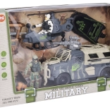 Akčný vojenský set pre malých stratégov ponúkne hodiny zábavy na súši, vo vzduchu aj na vode. Súčasťou je vozidlo s dĺžkou 25 cm, figúrky vojakov a bohaté príslušenstvo. O ešte väčší zážitok sa postarajú svetelné a zvukové efekty aktivované tlačidlom na zbrani vozidla. Vďaka voľným kolesám je jazda plynulá a pripravená na každú misiu.