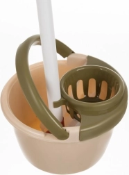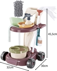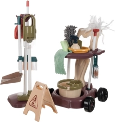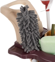Kočík s ergonomickou rukoväťou - kočík na štyroch širokých kolesách, vyrobený z vysokokvalitného PP plastu, bol navrhnutý tak, aby sa s ním ľahko manipulovalo. Ergonomická široká rukoväť uľahčuje deťom riadenie kočíka aj pri hre na cestách. Na dvoch policiach je možné umiestniť rôzne prvky súpravy: vedro so sitkom na mop na spodnej polici a misku, podložku, žmýkačku a mydelničku na hornej polici. Vďaka špeciálnym otvorom možno do vozíka umiestniť okrúhlu prachovku, hubku a mop, čo umožňuje ľahký prístup ku všetkým nástrojom. Po stranách vozíka sú dva háčiky na zavesenie utierky z mikrovlákna.