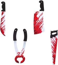 Detailne spracované tvary nožov, píl a sekáčikov s efektom krvi dodajú priestoru pôsobivú, no bezpečnú halloweensku atmosféru.