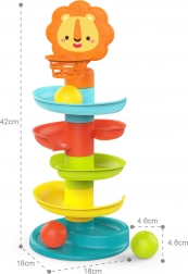Táto farebná špirálová veža pomáha rozvíjať motorické zručnosti, koordináciu a presnosť vašich detí. Päť úrovní zaručuje dlhodobú zábavu, zatiaľ čo sympatický lev na vrchole môže inšpirovať deti k cieľom a zlepšeniu ich schopností. Loptičky obsahujú drobné elementy vydávajúce zvuky a ponúkajúce dodatočné zmyslové podnety. Hračka je vyrobená z bezpečného a testovaného plastu pre maximálnu bezpečnosť malých hráčov.