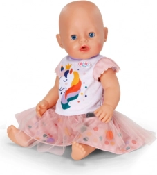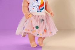 Doprajte svojej bábike magický štýl s jedinečnými tutu šatičkami s motívom jednorožca. Set tvorí biele tričko s krátkym rukávom a hravou potlačou jednorožca, doplnené ružovou tutu sukňou z tylu so skutočnými farebnými pomponmi pod vrchnou vrstvou. Kombinácia jemných materiálov a elastického pásu uľahčuje obliekanie a je pohodlná pri hraní.
