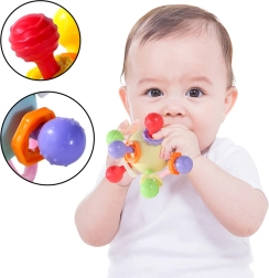 Vstavaná hrkálka jemne znie pri pohybe, čo podporuje rozvoj sluchu a upútava pozornosť dieťaťa. Kompaktná veľkosť a úchyty prispôsobené pre malé ruky umožňujú ľahké uchopenie, otáčanie a stisk, čím sa trénuje koordinácia a sila úchopu.