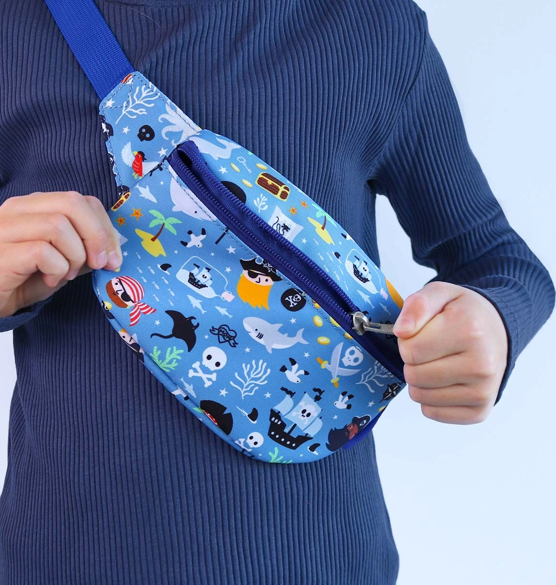 Ideálna detská ľadvinka pre malých pirátov s nastaviteľným popruhom. Dokonale sa hodí na nosenie okolo pása alebo ako crossbody kabelka. Ľahko do nej uložíte peňaženku, mobilný telefón a drobné cennosti.