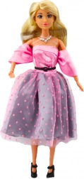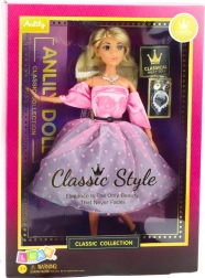 Bábika Anlily je oblečená v klasických ružovo-bielych šatách s tylovou vrstvou, ktoré pridávajú na elegancii a štýle. Rozšírená sukňa s jemným priesvitným tylom a saténový korzet s rukávmi tvoria pôsobivý celok.