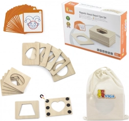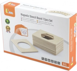 Táto jedinečná sada obsahuje 12 kusov drevených šablón, ktoré sú ideálne pre deti od 3 rokov. Každá šablóna má magnetický podklad, ktorý uľahčuje manipuláciu a zaisťuje, že zostane na mieste.