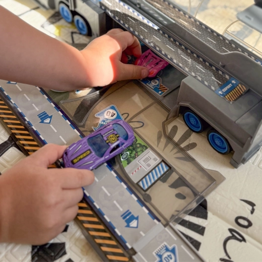 Kamión funguje ako pojazdný transportér aj ako prenosný kufrík na autíčka a príslušenstvo. Deti si tak ľahko vezmú celú sadu kamkoľvek so sebou.