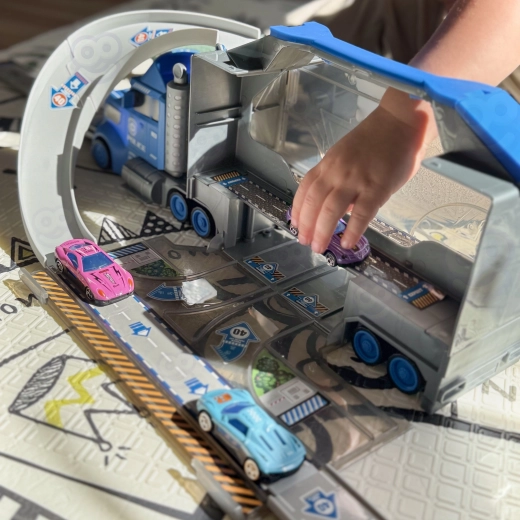 Veľký policajný kamión značky WOOPIE sa behom chvíľky premení z prepravnej súpravy pre autíčka na plnohodnotný pretekársky set s garážou a dráhou. Po otvorení návesu sa odhalí vnútorná herná zóna s rampami, slučkami a značkami, kde deti môžu usporadúvať napínavé preteky a súboje.