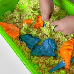 - Kinetický piesok (viac farieb), prenosný box/vanička s vekom, zvieracie formičky, lopatka, hrable, modelovacie tyčinky