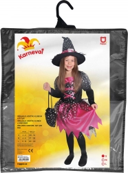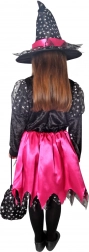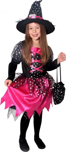 Magický kostým pre malé čarodejnice! Tento čierno-ružový kostým je ideálny pre dievčatá od 4 do 6 rokov, zdobený ružovými stuhami a striebornými hviezdičkami.