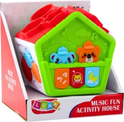 Domček ponúka 3 hudobné režimy (pesničky, melódie, zvuky zvierat), učí farby a čísla a prináša pestré zmyslové podnety pre zrak, sluch i hmat. Bezpečné prevedenie bez ostrých hrán a kvalitné materiály zaisťujú pokojné a radostné hranie.