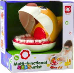 Bohaté príslušenstvo zahŕňa zubnú kefku, vŕtačku, kliešte, misku, možidlo, fľaštičky s „liekmi“, stojanček, tematické značky s čokoládou a cukríkom aj 8 vyberateľných zubov. Vďaka bezpečnému prevedeniu a zaobleným hranám je hračka vhodná pre deti a ľahko sa udržiava.